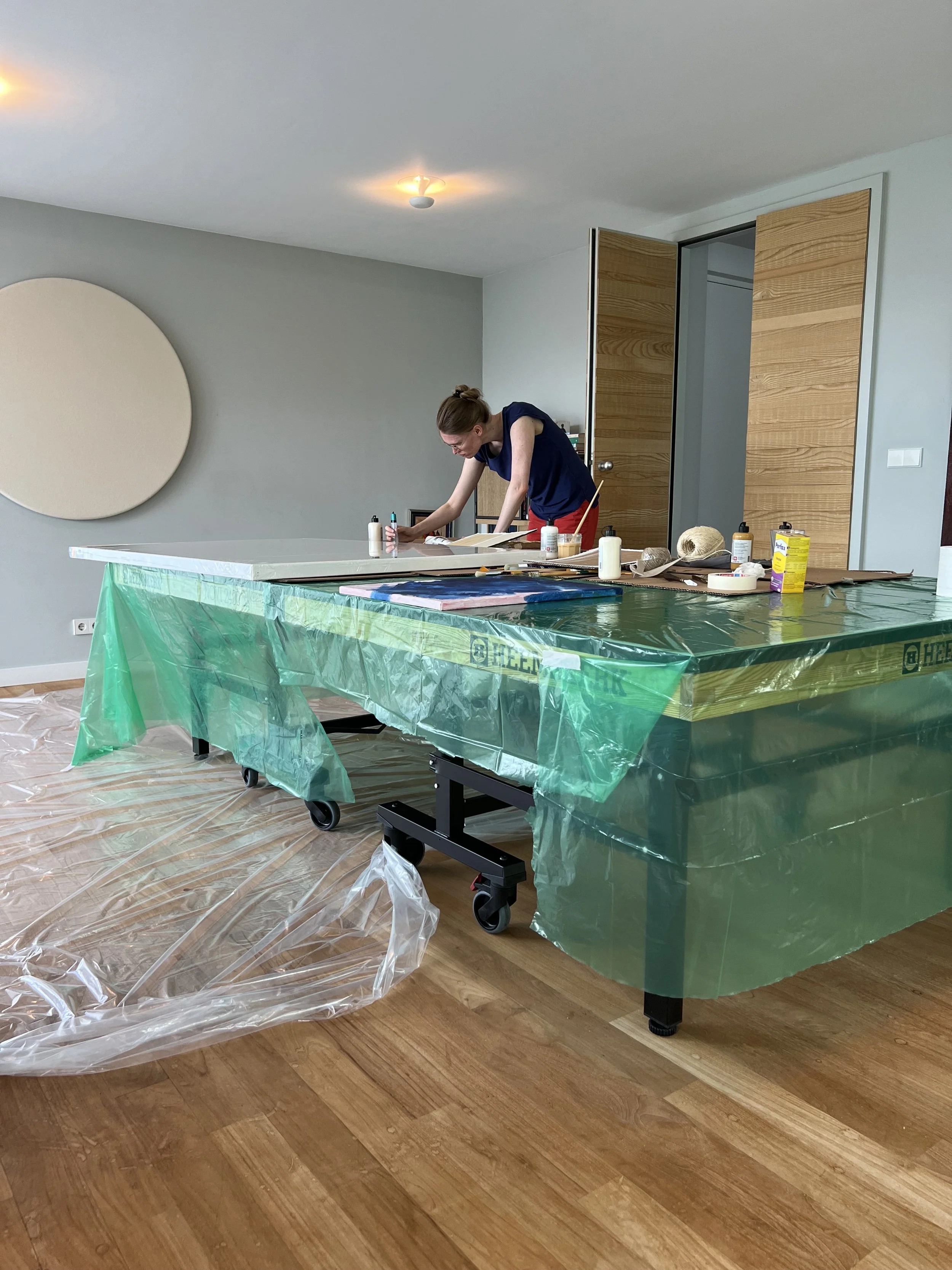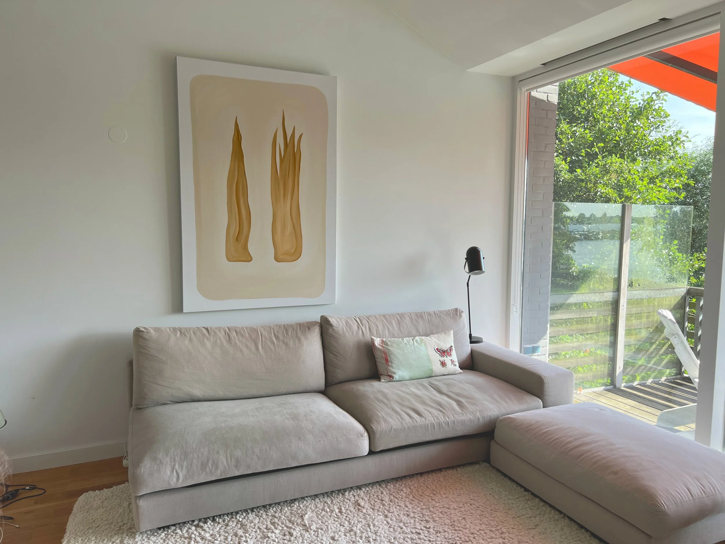 Dit schilderij is een persoonlijk project dat ik maakte in opdracht van mijn vader. Het combineert een gedeelde visie met mijn eigen creatieve invulling. Met organische vormen en een neutrale kleurenpalet sluit het naadloos aan bij een interieur vol natuurlijke materialen, terwijl het een subtiel verhaal vertelt over samenwerking en individuele expressie.