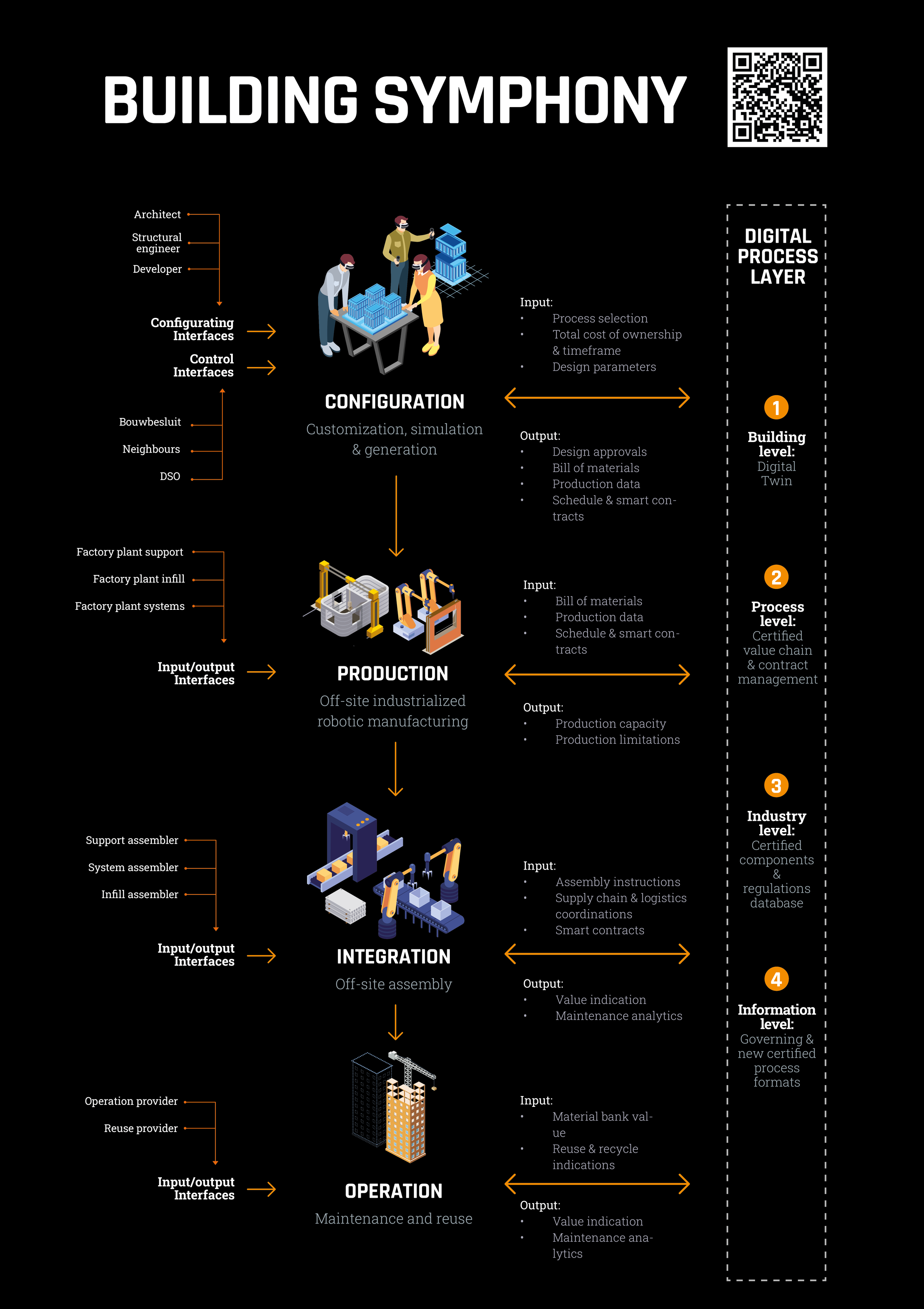 Informatie op verschillende levels van diepgang, hiërarchie door lettergrootte en dikte. De lichtblauwe gestreepte lijn visualiseert de digitale ‘Data management/Building Symphony’.